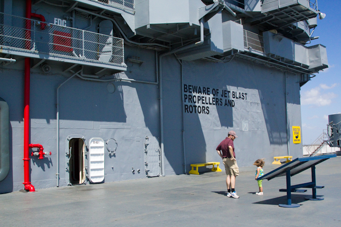 We climbed up the narrow staircase to the flight deck after paying our entrance fee and Nick stood Kate on the deck. We expected her to start running around, since it wasn't crowded at all, and point out planes and colors and ships in the bay. Instead, she stood in place and began to cry...which led to screaming that she "want to go home!". She wasn't moving. Apparently it was quite scary for her (the wind was quite swift) and she refused to move.