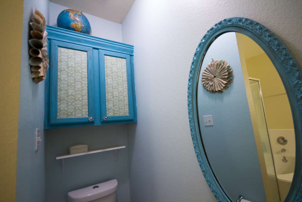 So here's my cabinet now, which I painted and mod-podged scrapbook paper on the doors to give it some pizzazz before we actually moved into the house. This cabinet was one of the day one projects I gave to Bill and you should've seen me, Bill, and my Mom crammed into this tiny spot trying to hang this cabinet. It was a tight fit...and we giggled a lot but we made it work. Then I took the same paint that I used one the fireplace and painted this corner to make it interesting.